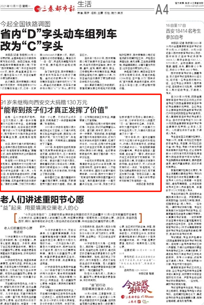 【三秦都市报】91岁朱继梅向西安交大捐赠130万元 “能帮到孩子们才真正发挥了价值”