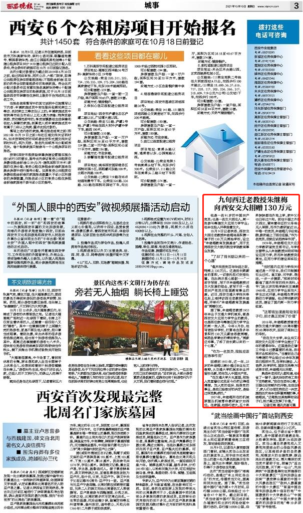 【西安晚报】九旬西迁老教授朱继梅向西安交大捐赠130万元