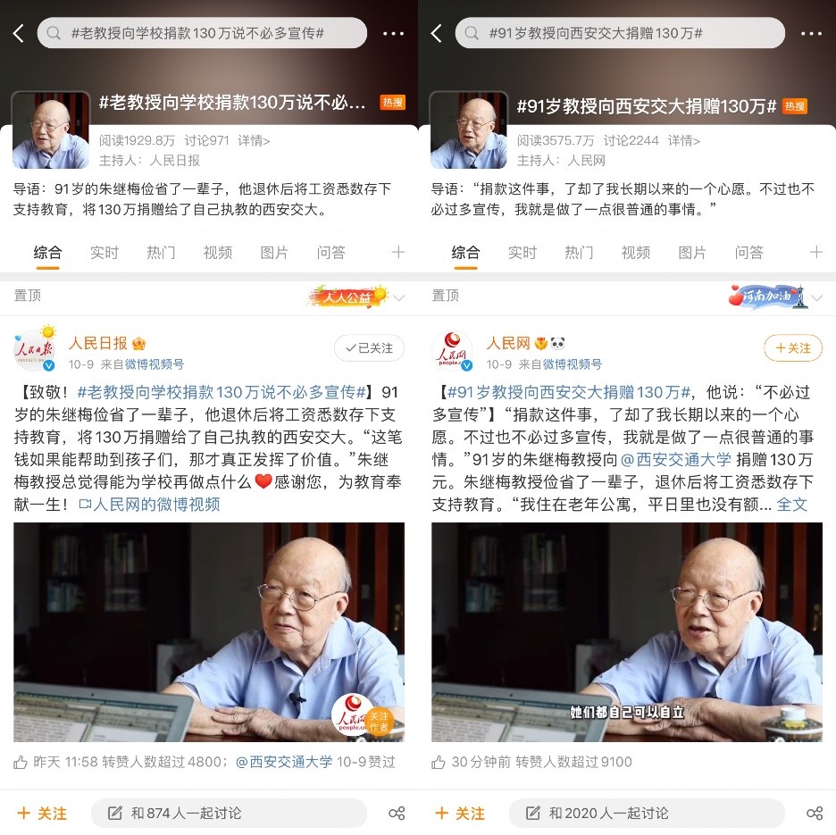 【人民日报、人民网微博话题】#老教授向学校捐款130万说不必多宣传##91岁教授向西安交大捐赠130万#