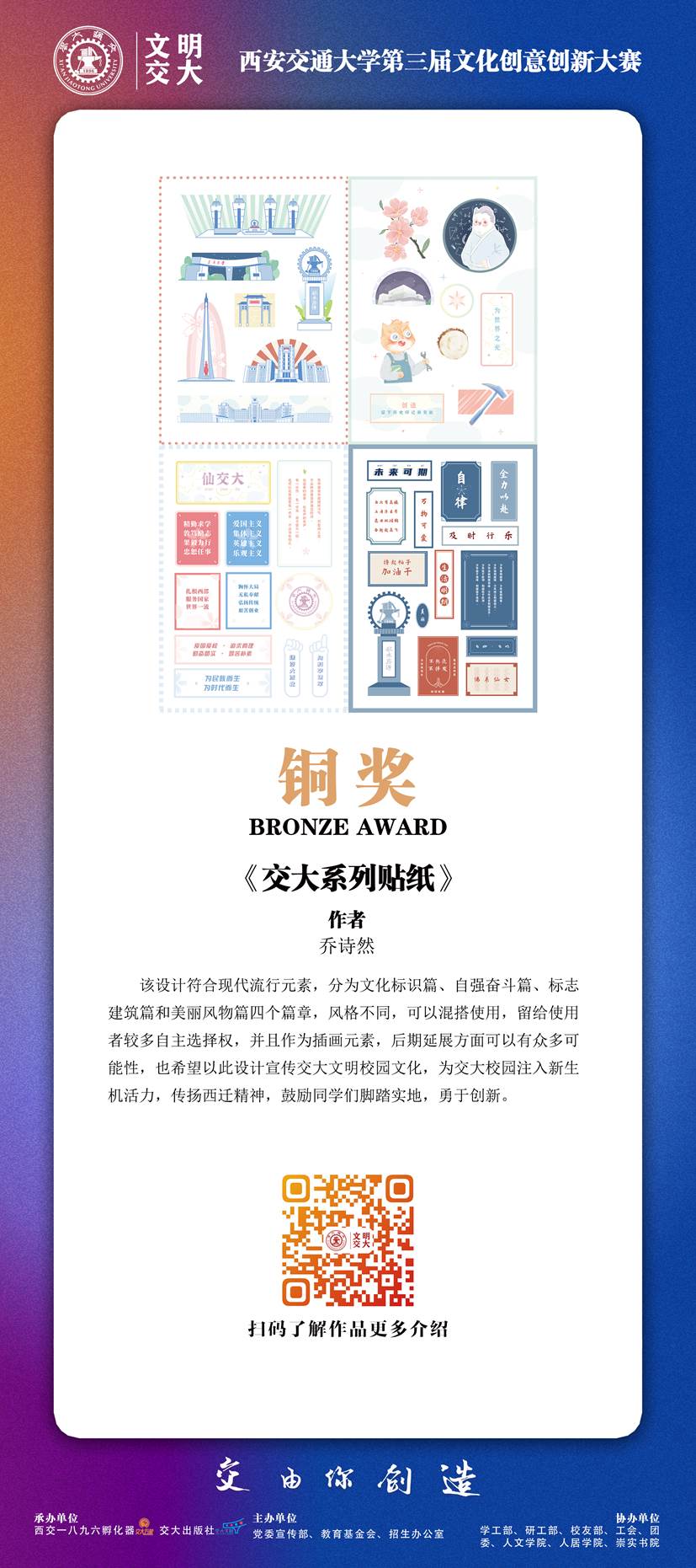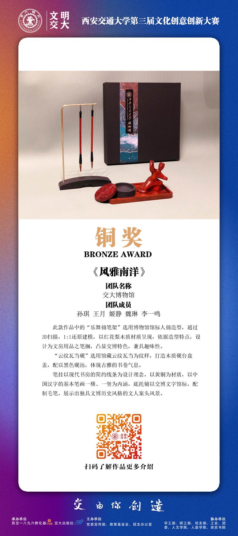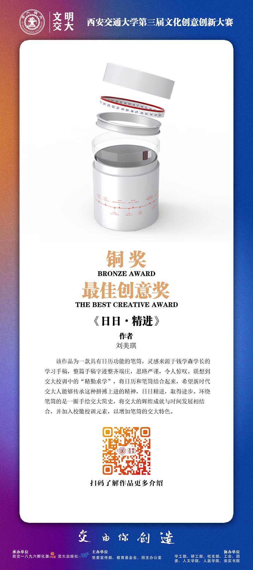 本次大赛共收到251条报名信息,195件作品,经过初评、复评、终评、公示等环节,最终评出金奖1名、银奖3名、铜奖6名、优秀奖15名、入围奖37名,并评出西安交通大学未来文创之星14人、最具人气奖5名、最佳创意奖5名、优秀组织奖4个、优秀指导教师奖6名。本次展览集中展出获得金银铜及优秀奖的25件作品,让我们一起透过文创的视角,走进带得走、有韵味、有想象力的交大。