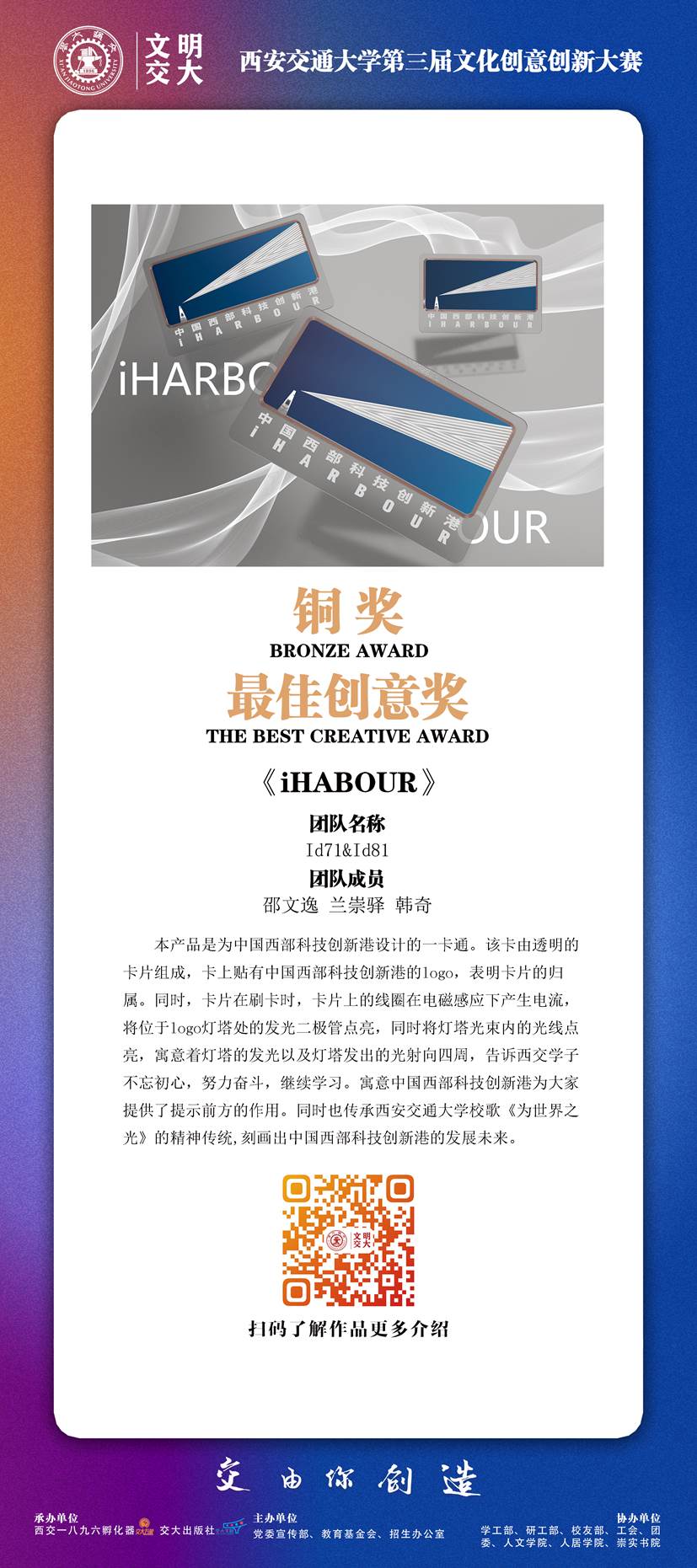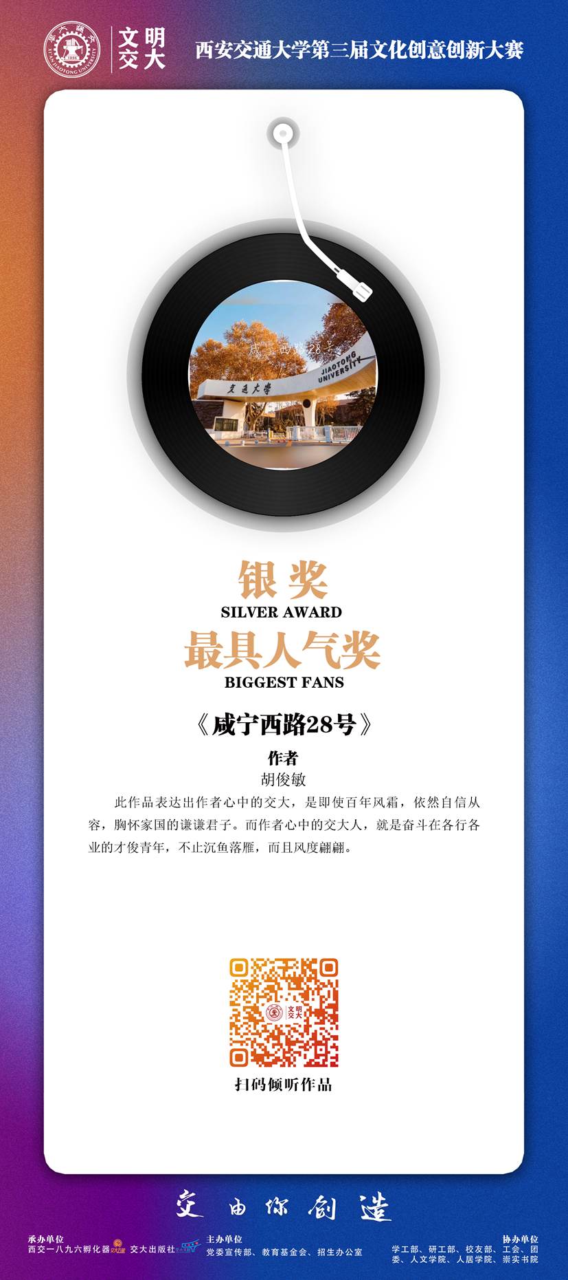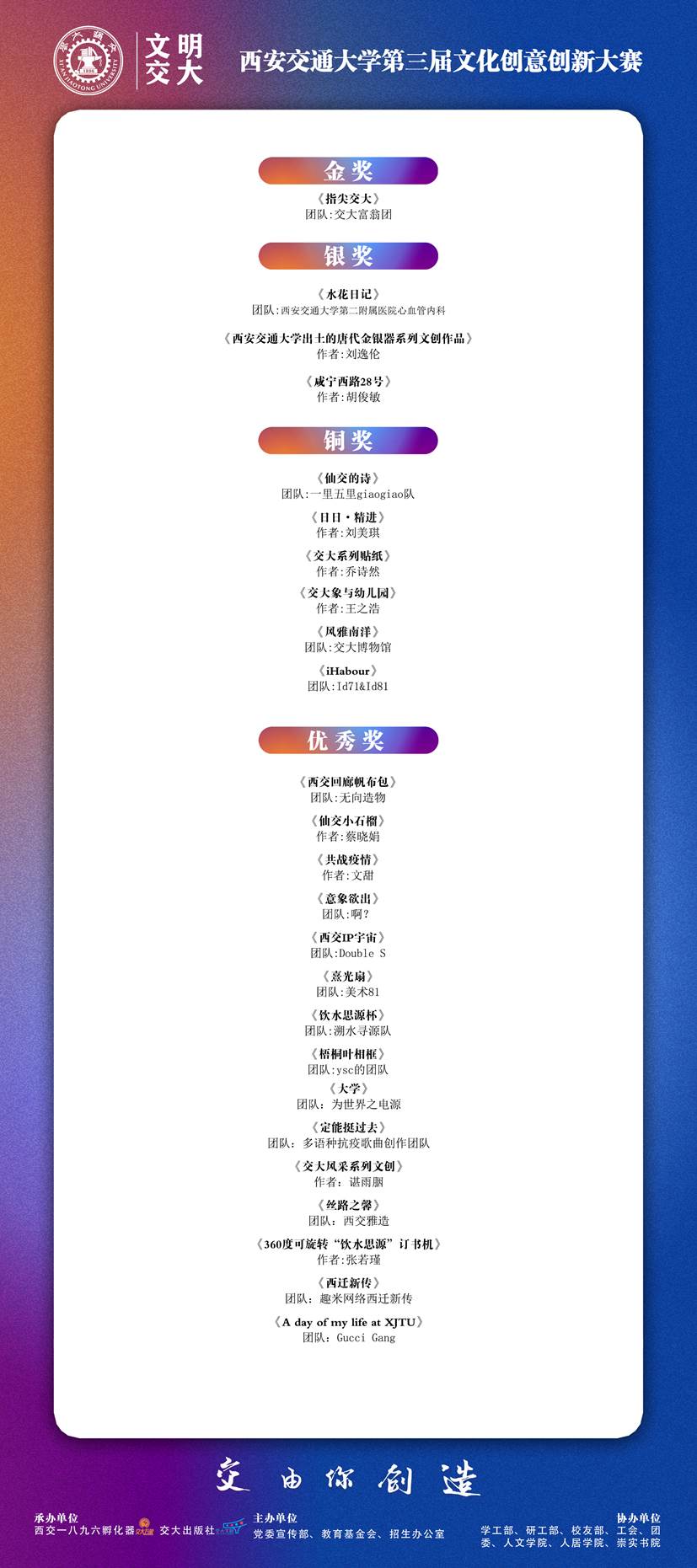 本次大赛共收到251条报名信息,195件作品,经过初评、复评、终评、公示等环节,最终评出金奖1名、银奖3名、铜奖6名、优秀奖15名、入围奖37名,并评出西安交通大学未来文创之星14人、最具人气奖5名、最佳创意奖5名、优秀组织奖4个、优秀指导教师奖6名。本次展览集中展出获得金银铜及优秀奖的25件作品,让我们一起透过文创的视角,走进带得走、有韵味、有想象力的交大。
