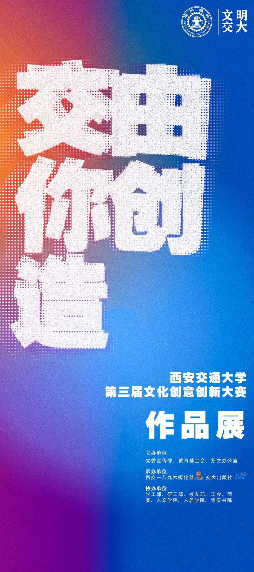文化是大学的灯塔和灵魂,其繁荣程度印证着大学的传播力和影响力,标示着大学科学发展的活跃力和续航力。2021年是中国共产党成立100周年、“十四五”开局之年,也是西安交通大学建校125周年暨迁校65周年、交通大学定名100周年,为进一步传承弘扬西迁精神,提升中国西部科技创新港形象传播,展现交大人迈向高质量发展的精神风貌,校党委宣传部、教育基金会、招生办公室联合举办了西安交通大学第三届文化创意创新大赛,以丰富的文化创意点亮文明交大。