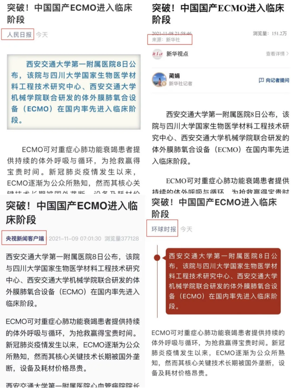 由西安交大联合研发的中国国产ECMO进入临床阶段,受到人民日报、新华社、央视新闻等多家主流媒体的关注报道。