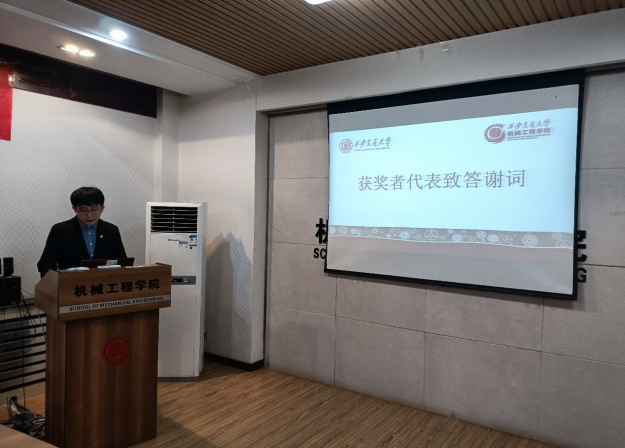 颁奖仪式之后,博士研究生张书源代表获奖学生发言,他表达了对母校、老师、同学以及NSK公司感激之情,并表示将继续以锐意创新的勇气、敢为人先的锐气、蓬勃向上的朝气努力提高自己,发扬西迁老教授无私奉献、以国家利益为己任的“西迁精神”,志存高远,脚踏实地,像恩斯克投资有限公司一样怀着一颗感恩的心回报社会,并祝愿公司蒸蒸日上,再创辉煌。