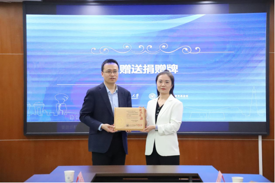 会上,邢晓强副秘书长与校友代表粟俊签订捐赠协议,接收校友代表施荣赠送的支票板,并向校友代表陈娟颁发捐赠纪念铭牌。