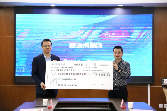 为支持西安交通大学教育事业发展,推动电力工业持续创新,我校1996级校友捐资设立“1996级电气校友基金”,用于支持电气学院人才培养及文化建设。其中,为奖励电气学院学习成绩优异、乐于助人的学生,设立“1996级电气校友奖学金”,截至2021年底,该奖学金已评选两届,累计奖励优秀学子16名;为纪念电气工程学院成功入驻创新港,1996级校友捐赠资金为创新港购置司母戊铜鼎一尊,以表达对母校未来发展的美好祝福。