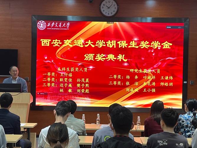 4月10日上午,西安交通大学“胡保生奖学金”颁奖典礼以线上线下结合的形式在兴庆校区彭康楼218会议室举行。胡保生教授的女儿、管理学院博导胡平教授,电信学部主任管晓宏院士,电信学部党委书记梁莉,自动化学院冯祖仁教授,教育基金会副秘书长邢晓强,自动化学院总支书记田锋教授,人工智能学院总支副书记魏平教授,自动化学院办公室主任林岩等以及获奖学生现场参加了颁奖仪式,胡保生教授的弟子等线上参加。电信学部自动化学院院长彭勤科教授主持颁奖典礼。