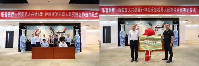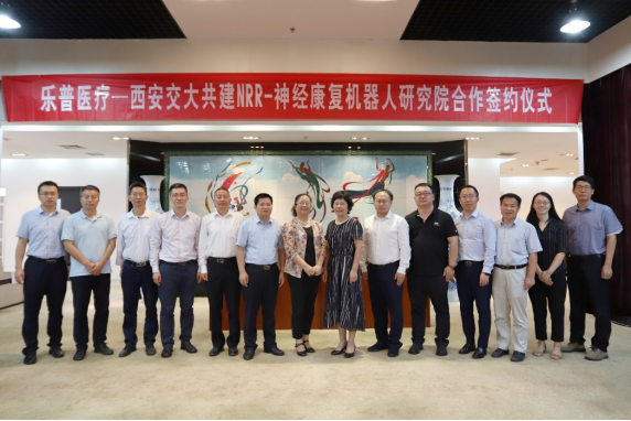 仪式上,上海乐普云智科技股份有限公司总经理王成、西安交通大学科研院常务副院长黄忠德代表双方签署合作协议;乐普(北京)医疗器械股份有限公司销售总监辛强与西安交通大学机械学院党委书记王朝晖共同为“NRR-神经康复机器人研究院”揭牌。