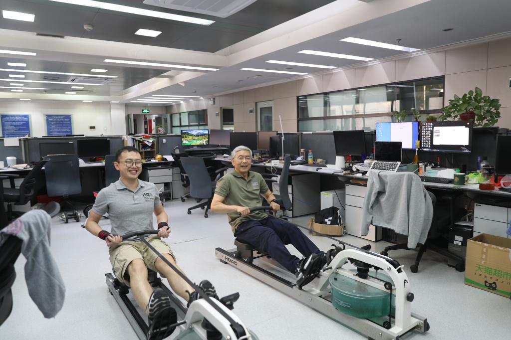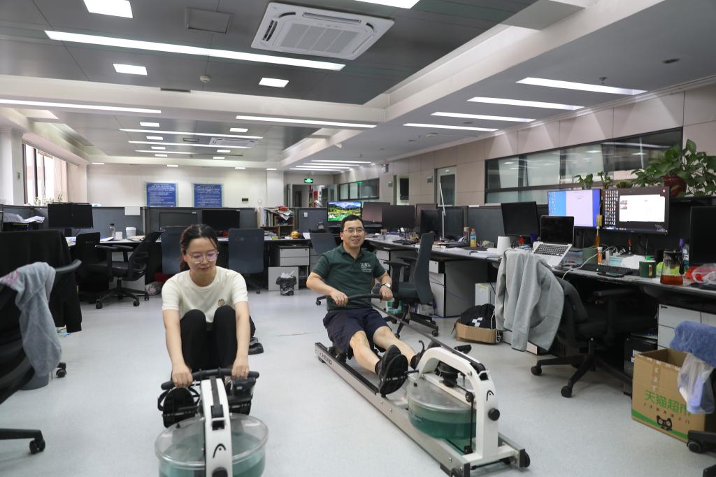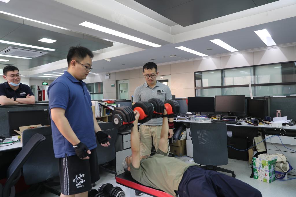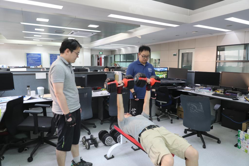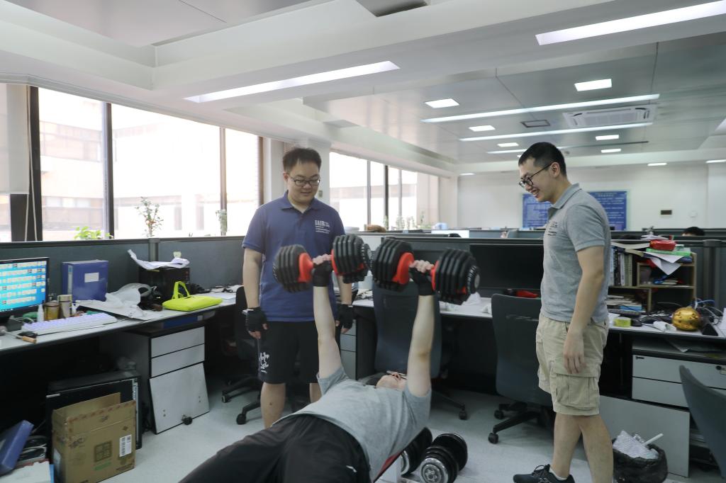走进西安交通大学人工智能学院,随处都能看到体育健身器材,工位旁摆放着健腹轮、划船机、哑铃等。在郑南宁院士的团队里,“体育达人”层出不穷。“没事推两组?”是团队师生打招呼的“常用语”,意思是要么卧推哑铃,要么站推健腹轮,一组12个。他们经常在工作学习间隙自发组织一场小型PK,参赛“选手”铆足劲把动作做标准,围观师生要么拍手称赞,要么也加入比赛。人工智能学院副院长李杰坚持游泳健身10年以上,几乎每天中午休息时间都去游泳馆“打卡”。她笑着告诉记者:“我想把卡都攒起来,看看今年‘打卡’的次数有没有超过去年。”袁泽剑教授为了鼓励一位学生养成健身习惯,提出“健身减重得奖金”,那名学生三个月从191斤减到155斤,养成了长期健身的习惯,获得了2000元奖金。博士生简志强本科阶段体育考试“险过及格线”,读研后在团队的带领下,如今可以轻松“拿捏”50KG卧推。