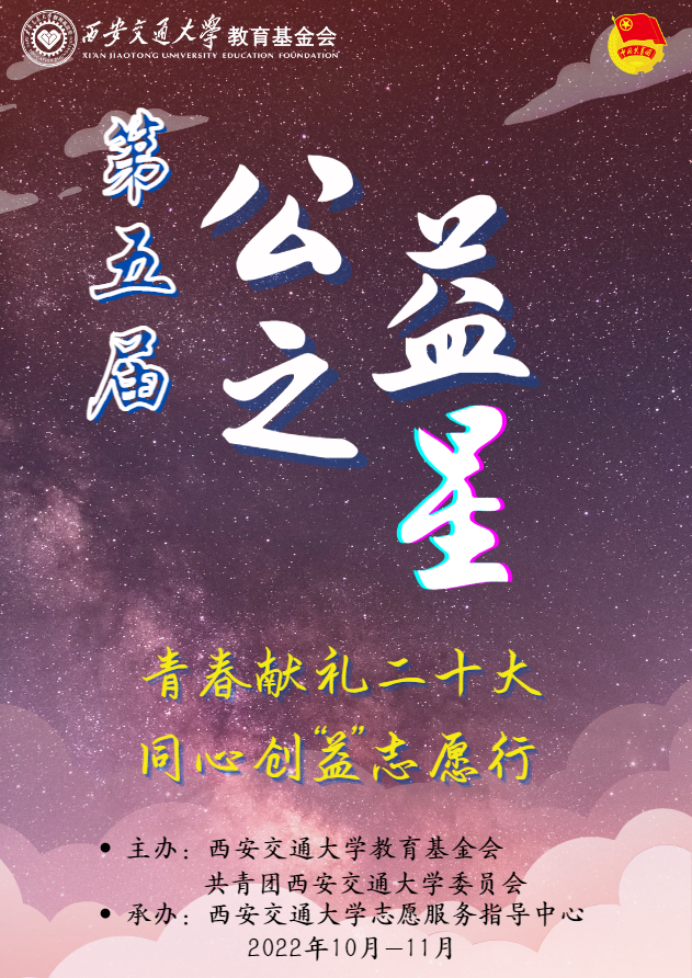 为传承以爱国主义为核心的“西迁精神”,弘扬“奉献、友爱、互助、进步”的志愿服务精神,激励交大学子胸怀“国之大者”,融入祖国建设和发展,西安交通大学教育基金会联合共青团西安交通大学委员会举办2022-2023学年第五届“公益之星”大赛,旨在评选出一批具有强烈社会责任感和风险意识,在校内外公益活动中表现突出,有积极社会影响的组织和个人,营造浓厚的志愿服务氛围,吸引更多青年学子参与志愿服务活动,用青年热情献礼党的二十大胜利召开。