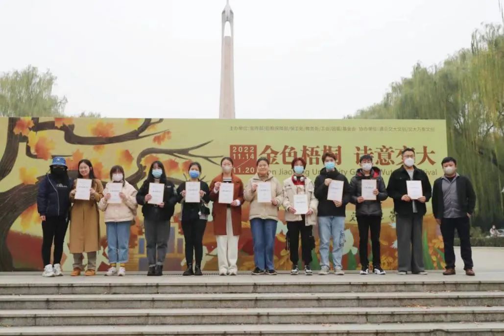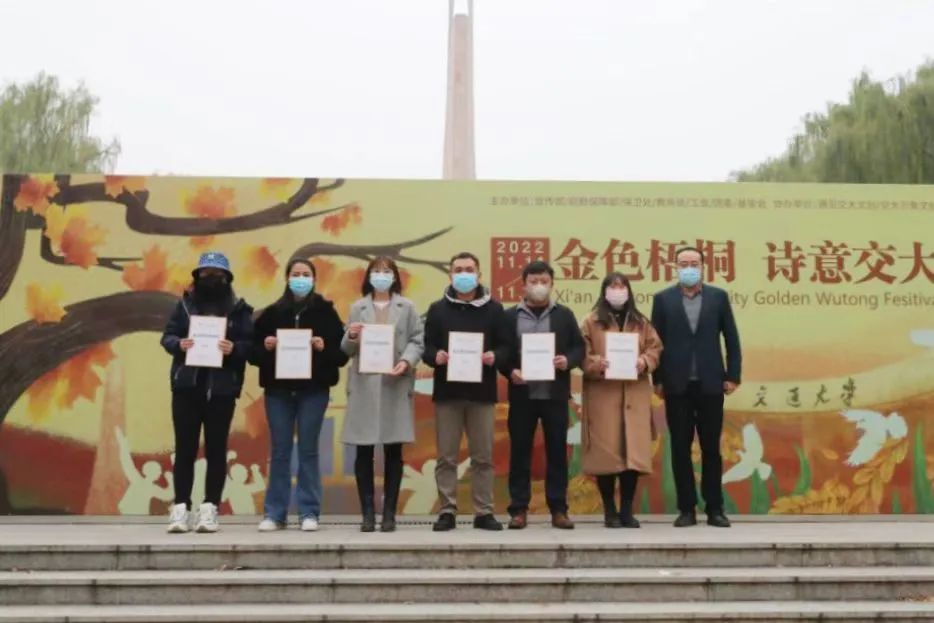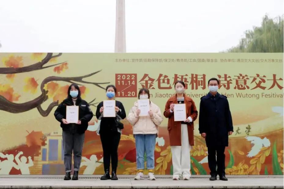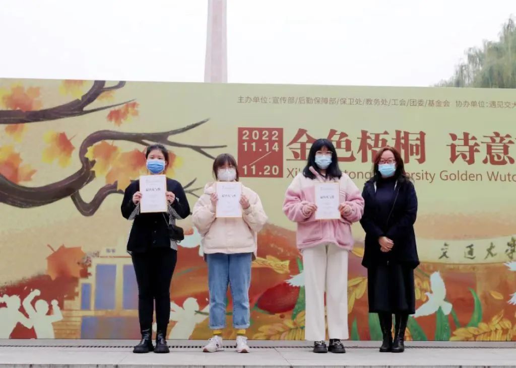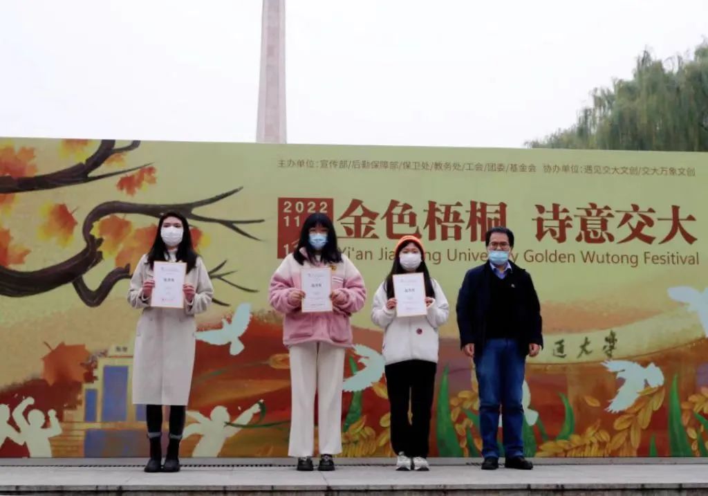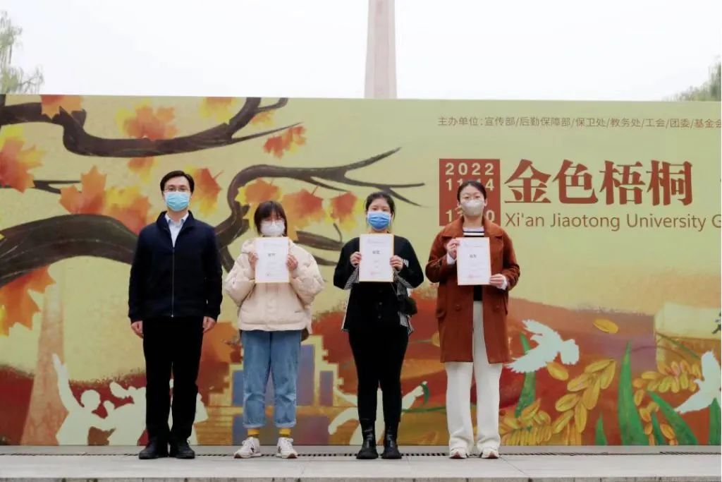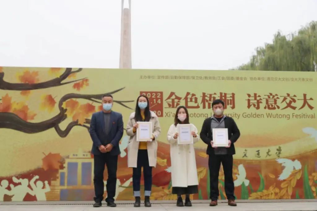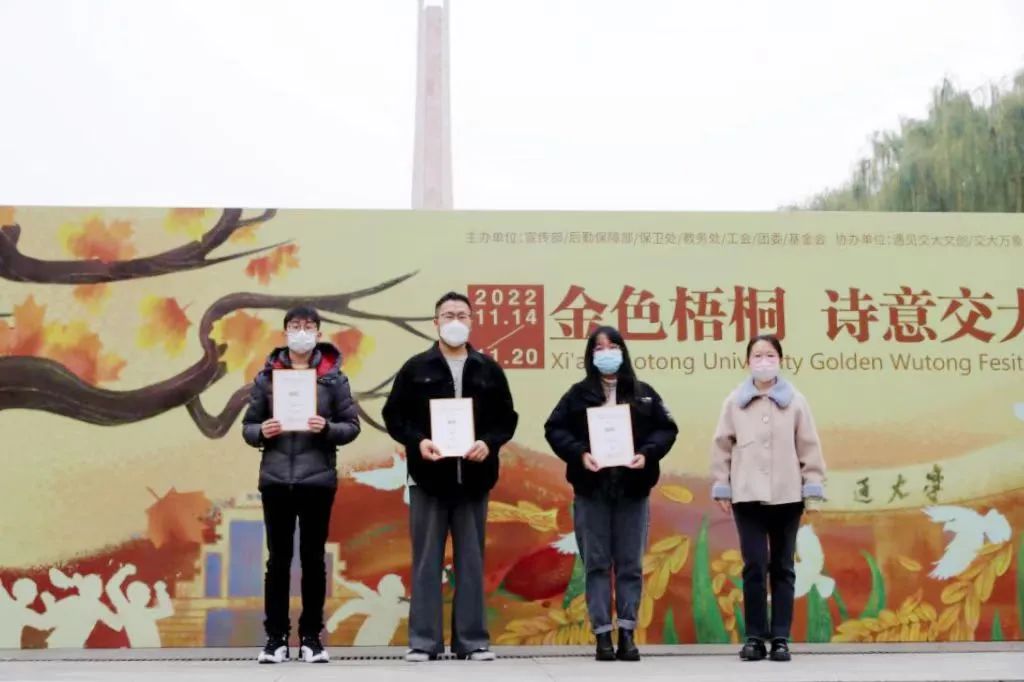 人居学院王蔚然、人文学院乔诗然等同学获得西安交通大学未来文创之星奖,优秀指导教师代表石峰、鲁鹏为他们颁奖。