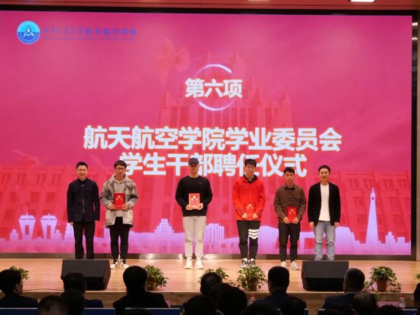 副院长卢同庆和钱学森书院院务主任田博共同为担任航天航空学院学业委员会的首批学生干部颁授聘书。