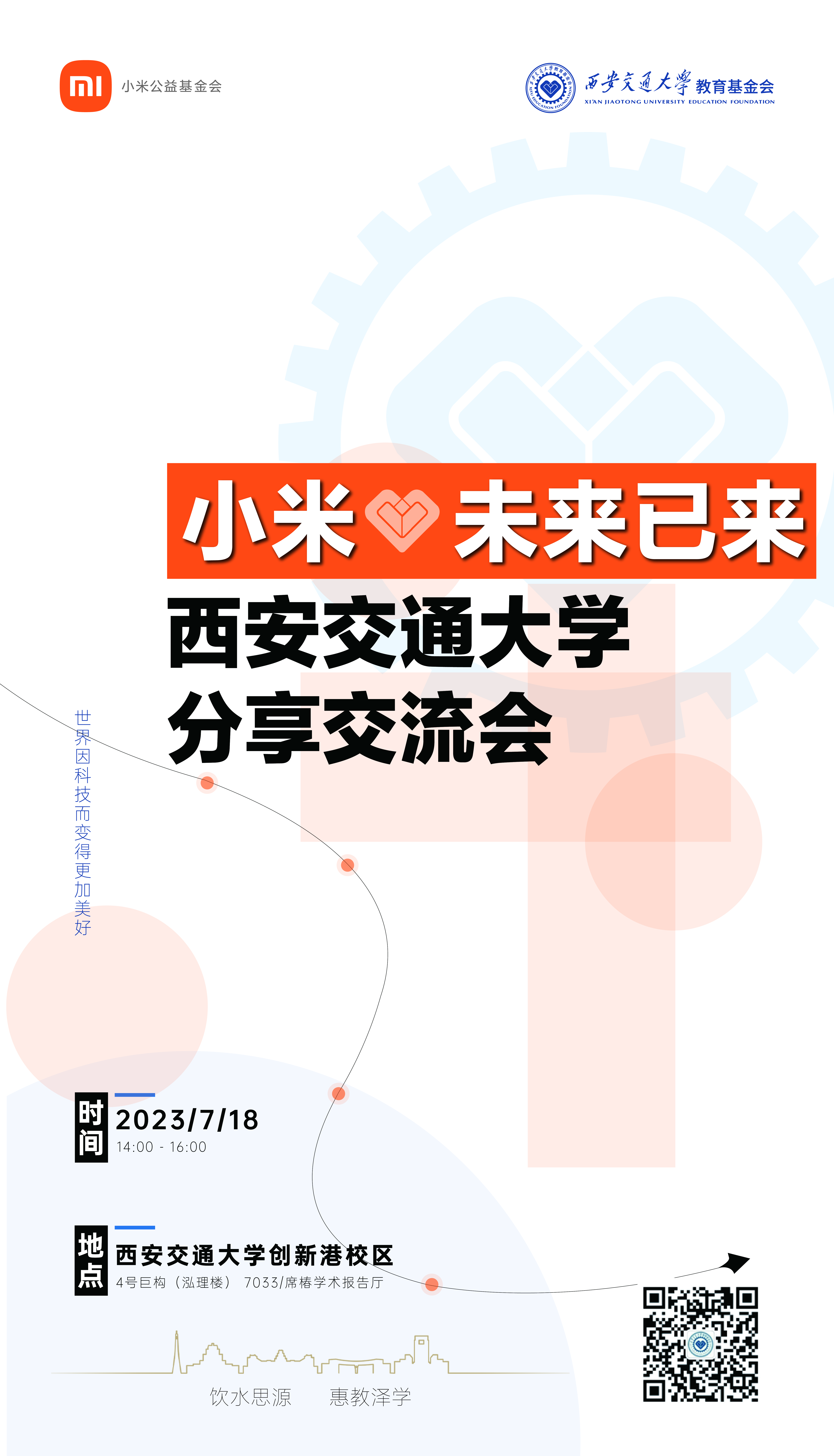 爱心捐赠,承载真情。7月18日,小米集团及小米公益基金会将来校交流,举办“小米奖助学金”捐赠仪式、“小米青年学者”授证仪式暨科研人才交流会,并于当天下午在创新港4号巨构(泓理楼)7033/席椿学术报告厅举办“小米·未来已来”西安交通大学分享交流会,进行宣讲并为交大学子答疑解惑。