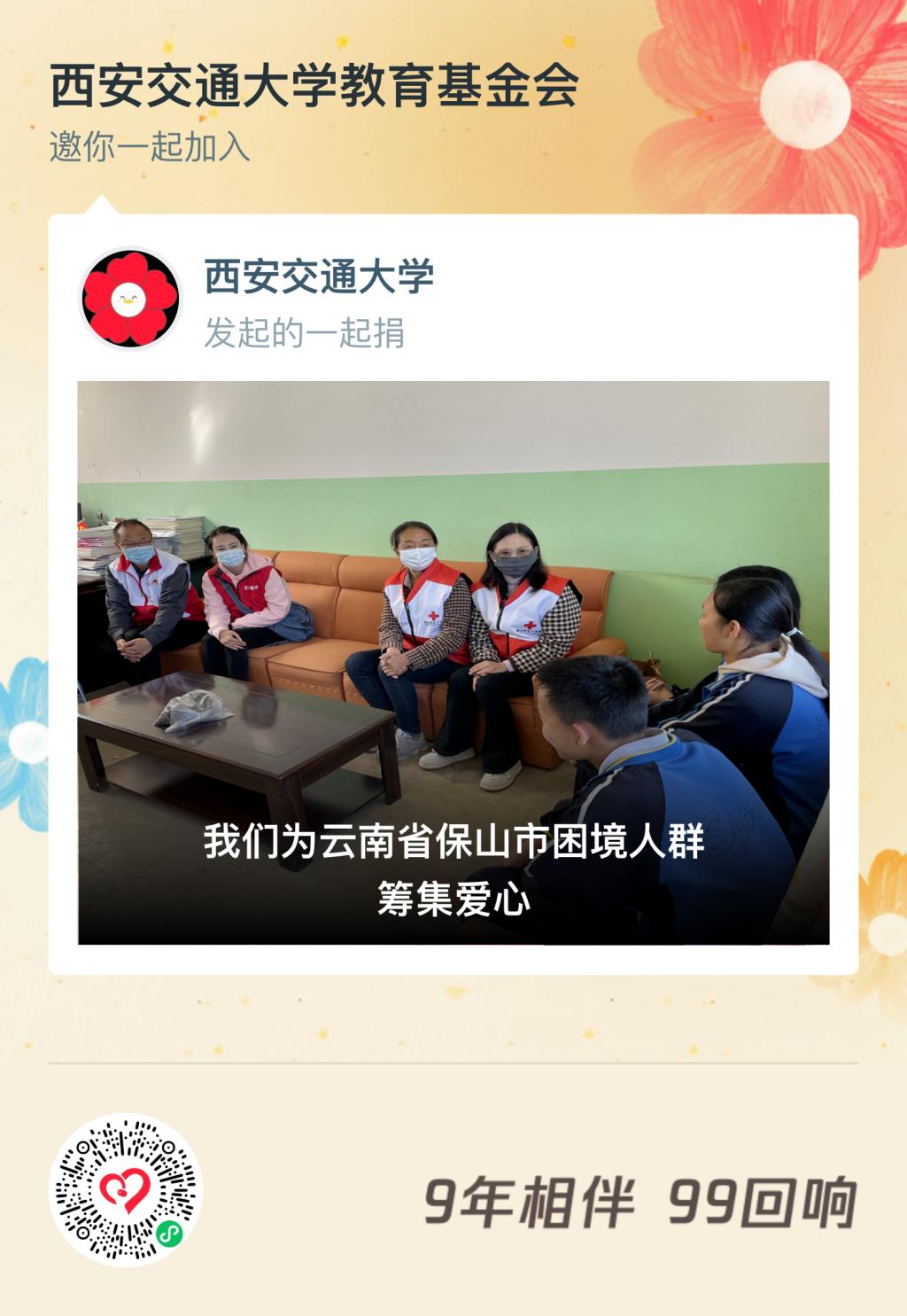 虽然西安与施甸远隔千里,但从结对帮扶之日起,交大人的心就与施甸紧紧连在一起。在此,我们向广大师生、校友和社会各界爱心人士、爱心企业发出倡议,希望大家积极参与“情系教育,助教兴学”募捐活动,共同为施甸县第一完全中学的教育事业贡献一份爱心!