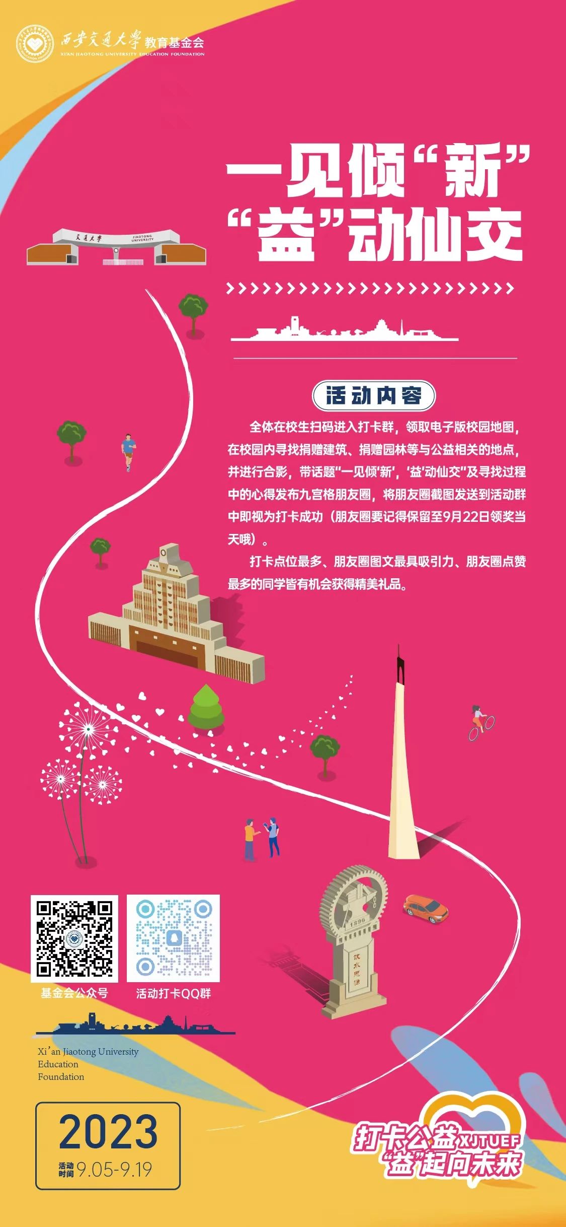 为活跃全校公益氛围,推进多样化公益校园建设,西安交通大学教育基金会特举办“一见倾‘新’,‘益’动仙交”活动,鼓励同学们走出宿舍,漫步校园,在欣赏校园美景的同时,发现校园内的捐赠建筑或植物,了解每日路过、习以为常的这些建筑或植物背后的故事,更加深入了解校园,体悟交大“饮水思源”精神传统。