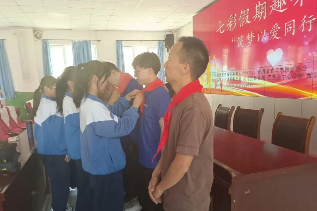 开班仪式上,巴燕中心学校校长王新财对西安交通大学支教团队的到来表示欢迎和感谢,并对学校情况进行了简单介绍。随后巴燕中心学校少先队员们为此次七彩假期趣味营会夏令营的全体辅导员佩戴红领巾。