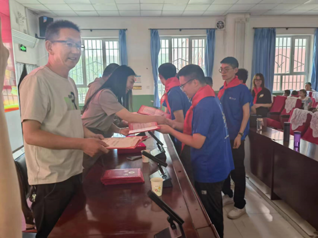 在开班仪式的最后,巴燕中心学校校长王新财、共青团湟源县委员会书记李晓瑞、西宁市城中区360关怀服务中心理事王生栋为队员们颁发辅导员聘书,将这份由聘书所寄托的教育重任正式交到了实践团队的手上。