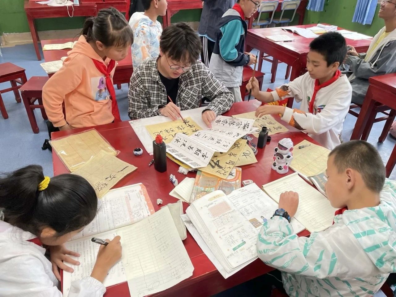 此外,何雨丰同学专门开设书法课程,一点点讲述,一笔笔勾勒,从文字起源到书法实践,让孩子们了解何为书法,为他们奔涌的想象力和创造力指明方向。