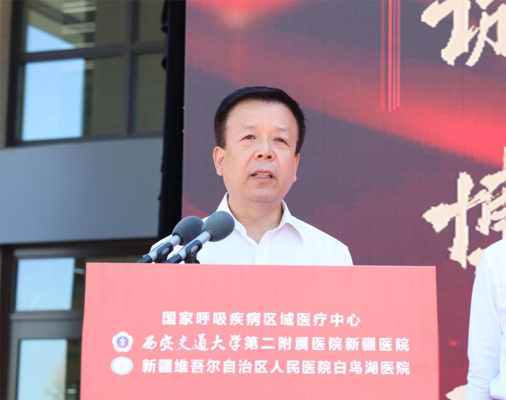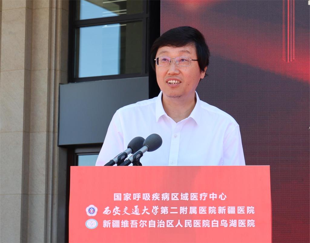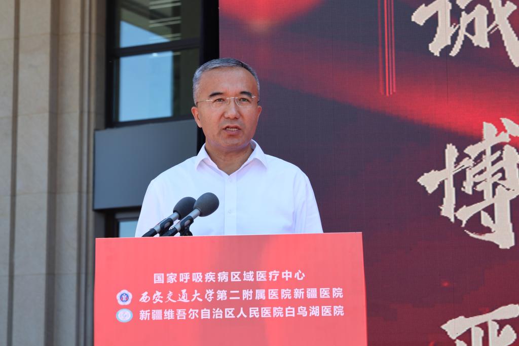 7月23日上午,西安交通大学校长、中国工程院院士张立群,新疆维吾尔自治区人民政府副主席凯赛尔·阿不都克热木出席西安交通大学第二附属医院与自治区人民医院共建国家呼吸疾病区域医疗中心(西安交通大学第二附属医院新疆医院)揭牌仪式并共同揭牌。西安交大党委常委、副校长吕毅,党委常委、医学部党委书记陈腾,二附院党委书记刘昌,二附院副院长、新疆医院院长张蓬勃出席活动。活动由自治区人民政府副秘书长李小忠主持。