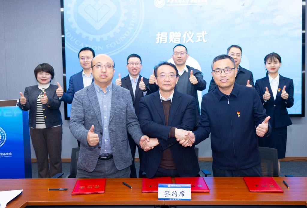仪式上,席光代表学校与两家爱心企业签署捐赠协议,单智伟为企业代表颁发捐赠铭牌。