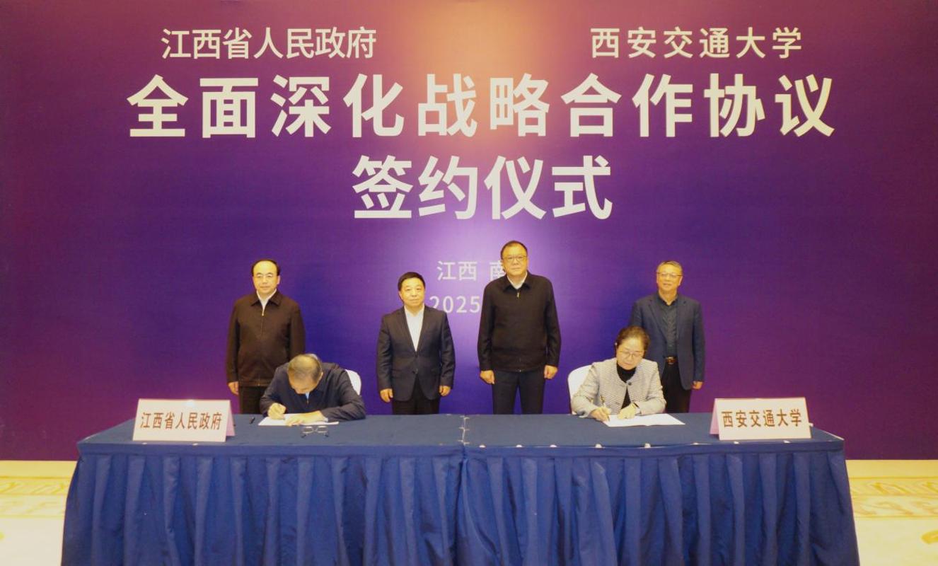 孙洪山、别朝红代表双方签署江西省人民政府和西安交通大学全面深化战略合作协议。叶建春、卢建军见证签约。