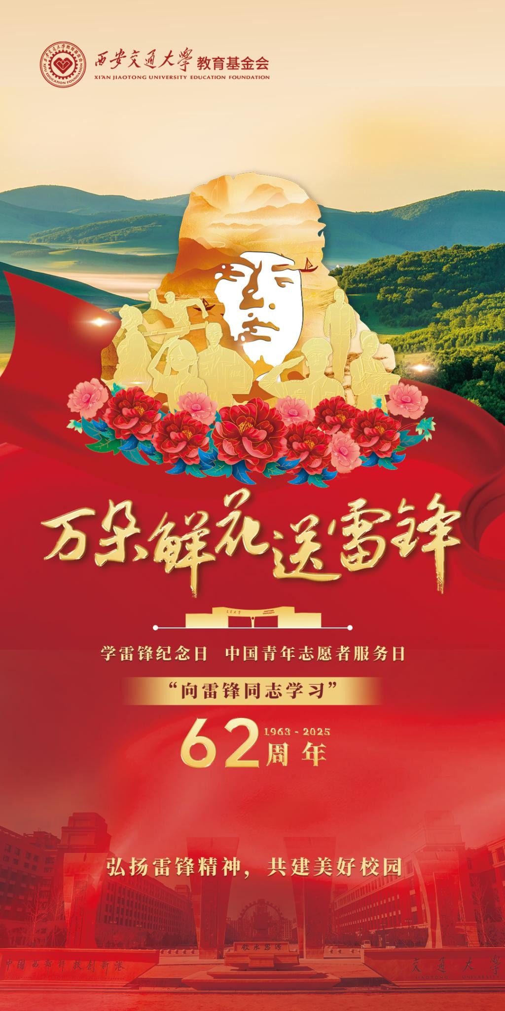 春意渐浓的三月,我们迎来了第62个“学雷锋纪念日”暨第26个“中国青年志愿者服务日”。雷锋同志“全心全意为人民服务”的精神,是中华民族永不褪色的精神丰碑,更是激励我们投身公益、奉献社会的力量源泉。在这个特殊的日子里,西安交通大学教育基金会向每一位心怀大爱的公益践行者致以崇高的敬意,也期待与您携手,让雷锋精神在新时代绽放更加璀璨的光芒!