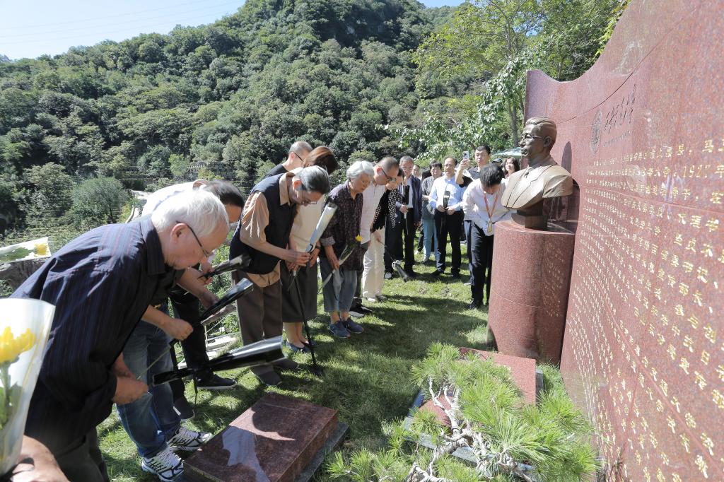 纪念仪式后,全体人员在彭康校长纪念雕塑和碑文处献花鞠躬、追思缅怀。