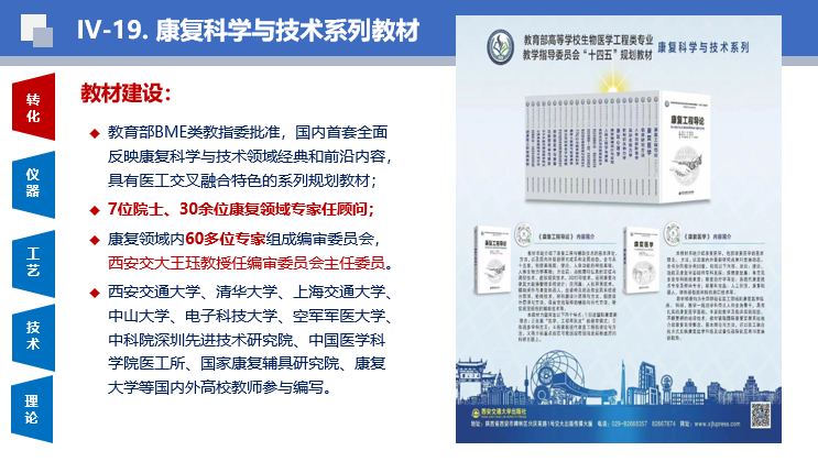 回国后,依据这18箱书和资料,她以拓荒者的勇气,在研究生院宋晓平副院长的支持下,牵头组织生命学院、医学院、机械学院和人文学院36名教师,在西安交大创建了以理、工、医、文、管多学科交叉知识结构为特色的康复科学与技术学科和20门专业课程的教学体系,填补了学校在该领域的空白。2003年,经教育部批准,西安交通大学建立了康复医学与理疗学学科硕士点和博士点,是全国率先建立该学科博士点的重点高校之一,并于2004年正式向全国招收硕士和博士研究生。王珏教授开设的《康复工程》课获评“陕西省精品课程”、“陕西省一流课程”;主编的《康复工程基础——辅助技术》获西安交通大学优秀教材奖。她牵头申报并作为编审委员会主任,组织全国康复工程领域专家,编写教育部生物医学工程类专业教学指导委员会“十三五”、“十四五”规划“康复科学与技术”系列教材(23本)。目前,该系列教材已出版5本,其他也在陆续出版中。王珏教授还受聘担任《中国大百科全书》第三版《现代医学》册:《现代康复医学》分册中“康复工程”板块的撰写负责人,组织国内康复工程领域专家编写了48个条目,合计6.3万多字。