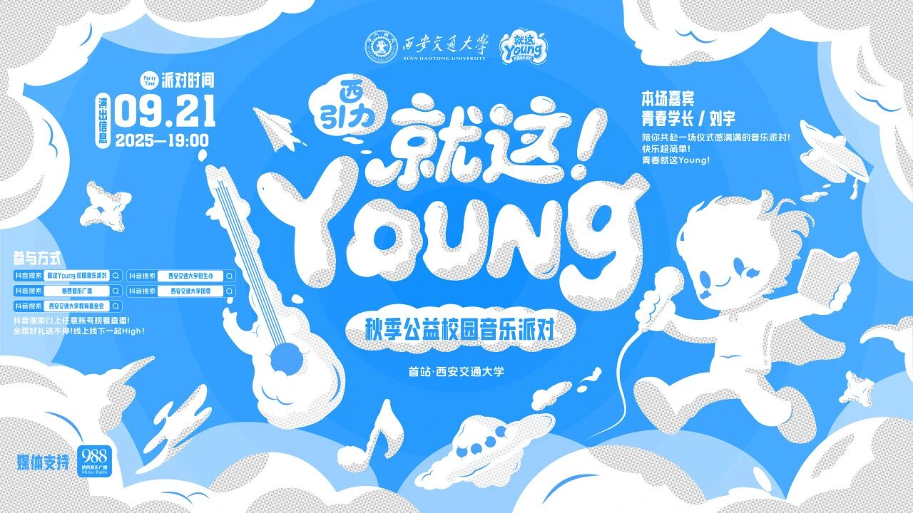 本次活动面向西安交通大学在校师生开放~更多门票领取方式请关注“西安交通大学团委”“西安交大教育基金会”微信公众号后续资讯。无法到场的小伙伴也别遗憾,我们为您准备了全程直播!锁定以下任意抖音账号,实时观看精彩现场:@就这Young校园音乐派对@西安交通大学团委@西安交通大学教育基金会@西安交通大学招生办@陕西音乐广播