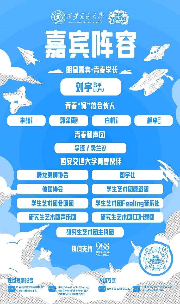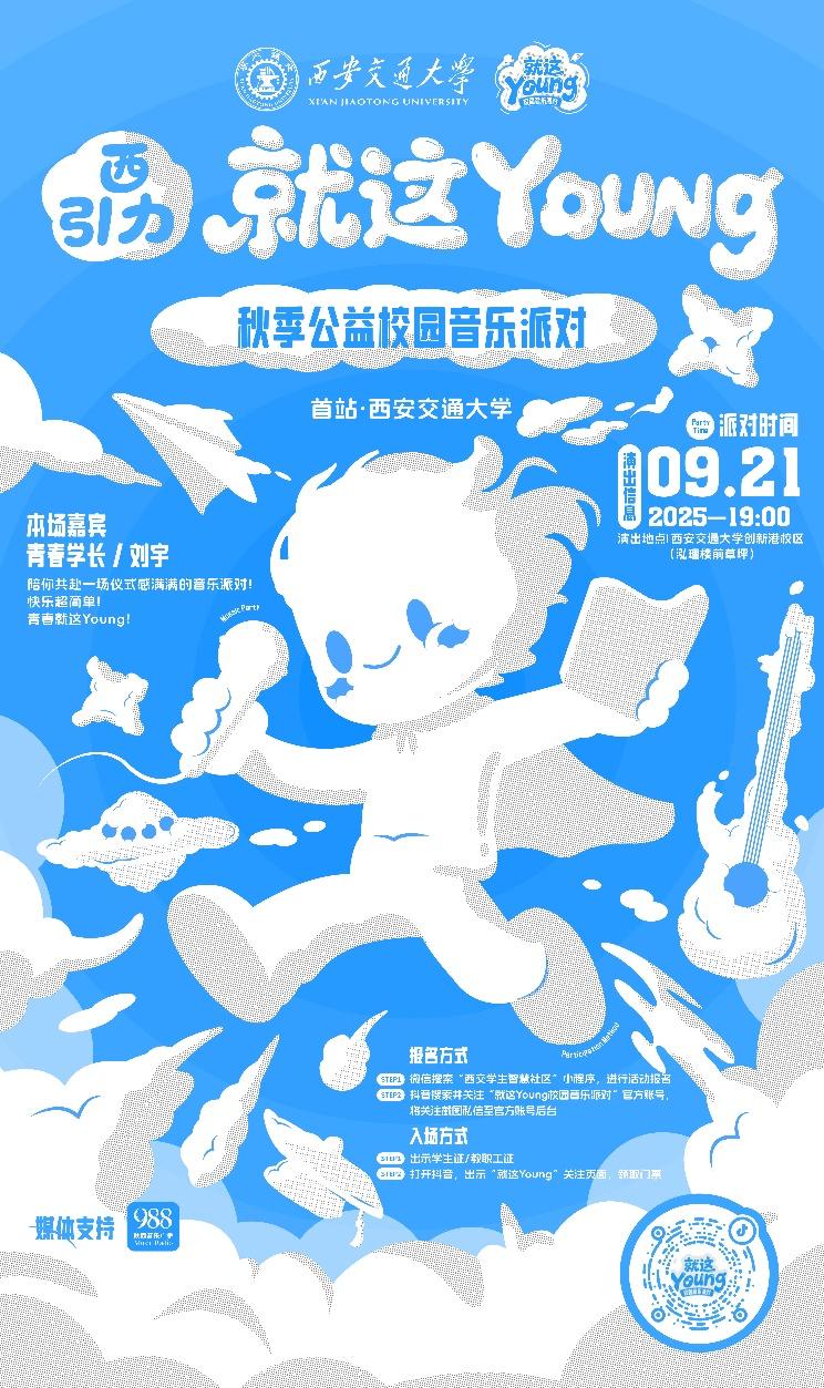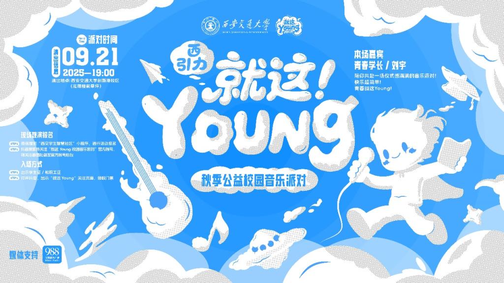 本次活动面向西安交通大学在校师生,领票及入场均需核验学生证/教职工证。STEP1微信搜索小程序“西交学生智慧社区”,寻找活动【第X波抢票】“西引力,就这Young”秋季公益校园音乐派对,点击报名;STEP2抖音搜索“就这Young校园音乐派对”并关注。