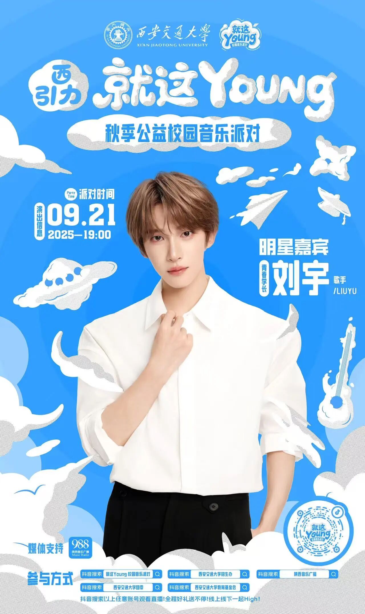 9月21日晚19:00西安交通大学创新港泓理楼南草坪嘉宾@刘宇yu将担任本场的青春学长空降现场,带来精彩舞台演绎!交大学子也将献上精彩演出!丰富彩蛋,等你来揭晓!