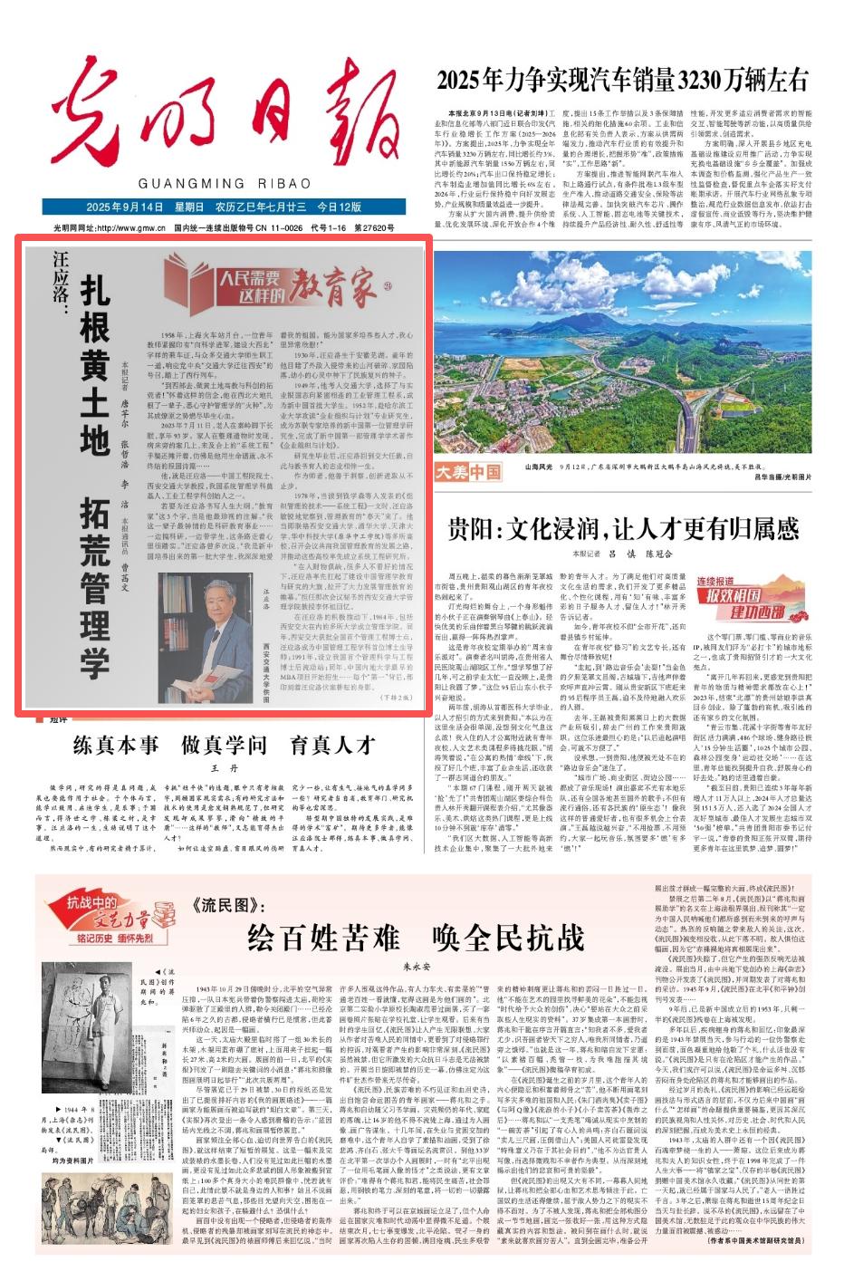2025年9月14日,《光明日报》头版刊发了《人民需要这样的教育家》系列报道之《汪应洛:扎根黄土地 拓宽管理学》,报道了中国工程院院士、西安交通大学教授,我国系统管理学科奠基人、工业工程学科创始人之一、“汪应洛贫困学生奖助基金”捐赠设立人汪应洛响应国家号召毅然西迁,扎根大西北,做黄土地高教与科创的拓荒者的故事。