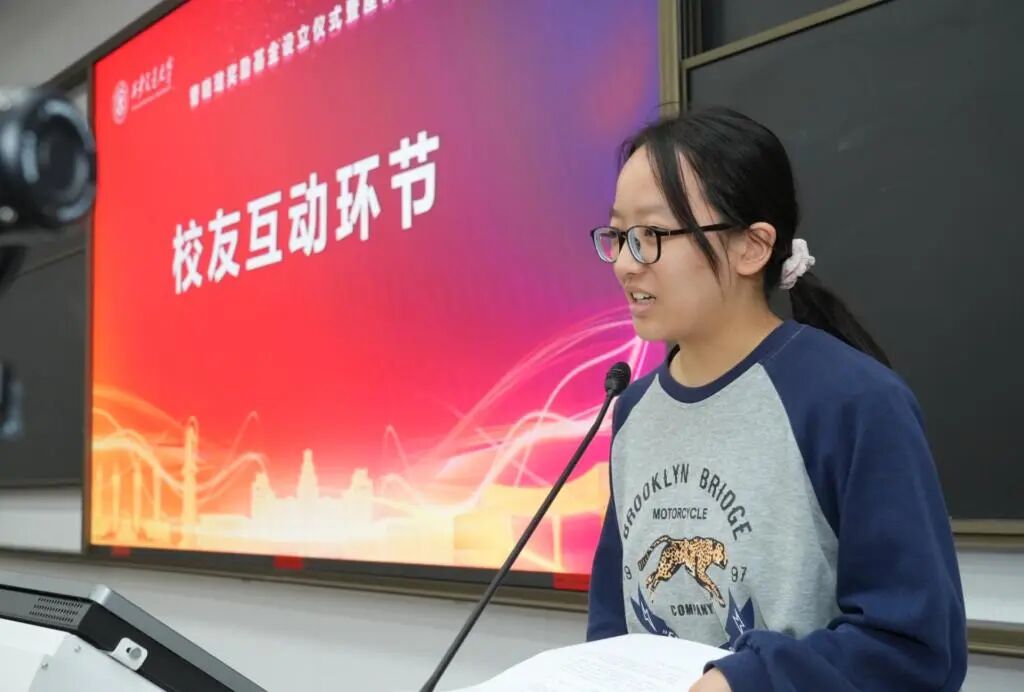 首批获奖学生代表上台分享。学业进步奖学金代表梅翔元和科学创新奖学金代表韩翔宇结合自身经历,讲述了在学业提升、科研攻关过程中如何感悟先辈初心,以坚韧意志克服困难、追求卓越的故事,字里行间满是对基金捐赠者的感恩之情,真挚的分享引发在场人员强烈共鸣。
