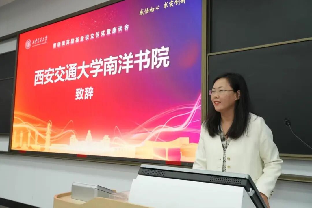 顾蓉对绝缘86级校友及首批捐赠校友代表的到来表示热烈欢迎,向曹晓珑教授及基金捐赠者致以诚挚感谢。她强调曹晓珑奖学金不仅仅是一份物质上的资助,更是一份精神上的激励,是一份对同学们刻苦求学的肯定,也是一份对大家未来担当大任的殷切期待。她特别汇报了在曹晓珑励学金的激励下,南洋书院获奖学子平均进步97名、最高进步182名的好成绩。希望获奖同学以榜样为镜,珍惜这份荣誉与激励,传承好西迁精神,在未来的学习生活中继续笃学敏行、感恩奋进,以优异的成绩回馈母校与社会,做挺膺担当的奋斗者。