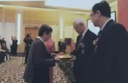 2015年,俞茂宏(右二)荣获何梁何利“科学与技术进步奖”数学力学奖时的领奖照片