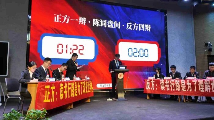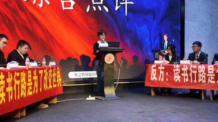 辩论赛下半场围绕“读书行路是为了改变/理解世界”展开激烈辩论。正方一辩开篇立论:读书行路是为主动改造世界,以改变之心激发行动、推动发展;反方则认为读书行路核心是理解世界,理解有独立价值,是探索本质与多元性的本源诉求。双方辩手引经据典,妙语连珠。王羽凡同学对上半场辩论进行了精彩点评,她充分肯定了双方辩手的思辨能力和逻辑严谨性,同时也指出了在论据使用和论证深度上的提升空间。