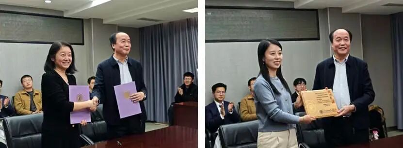随后,赵东升校友与韦娜代表双方签署申元奖学金捐赠协议,毛珊代表基金会为赵东升校友颁发捐赠纪念铭牌。