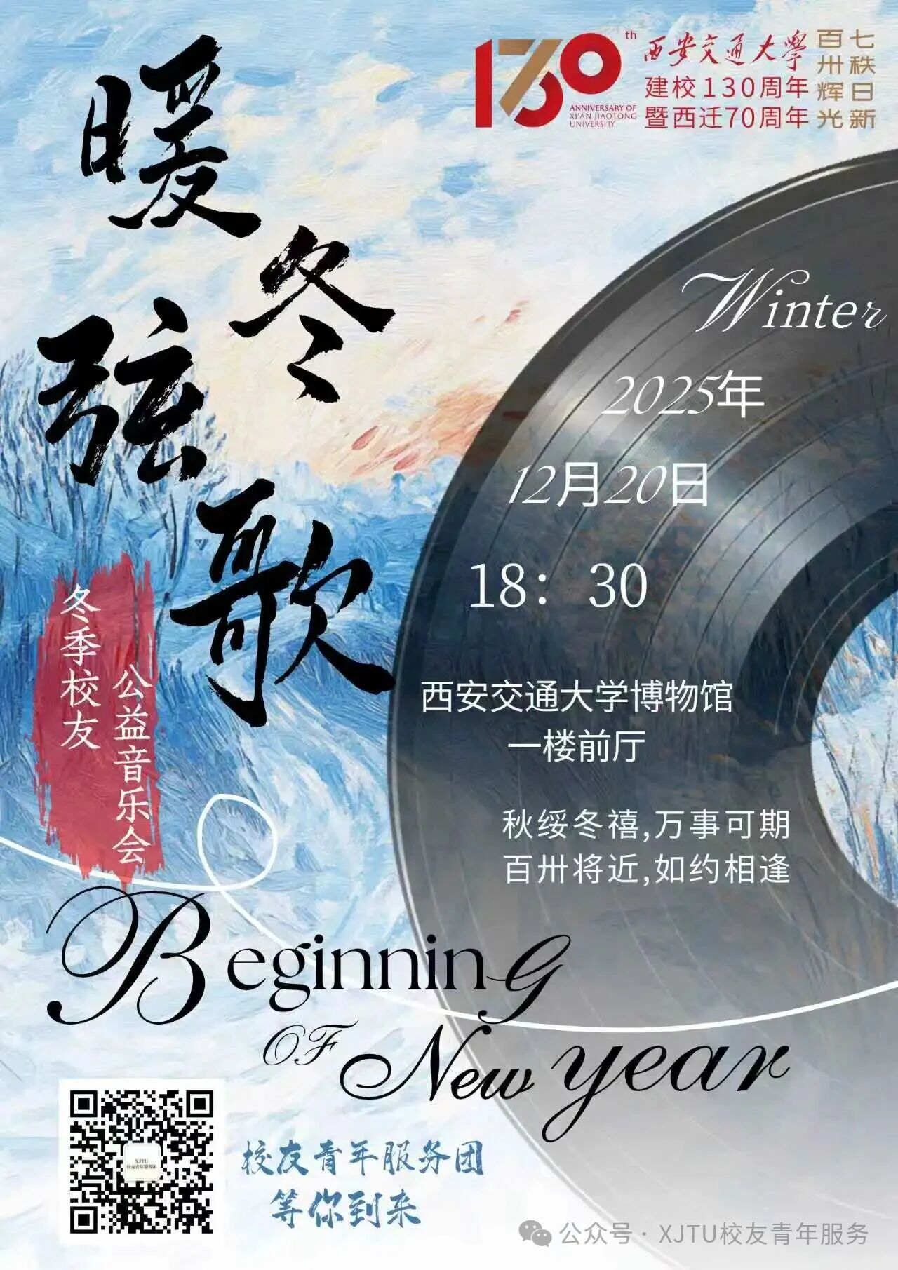 而今,寒冬已至,暖意犹存。我们诚邀您于2025年12月20日在西安交通大学博物馆再次相聚。本次演出既有熟悉的学长、老师和同学登台献唱,也有专业的助唱神秘嘉宾。