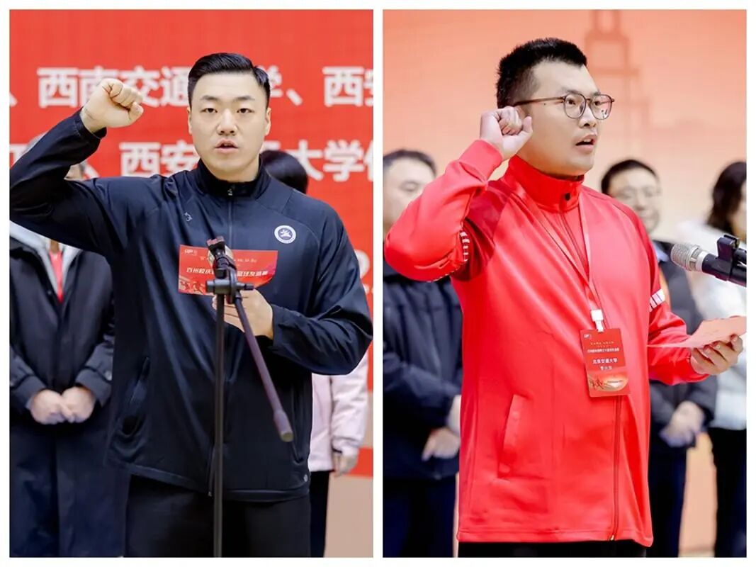 陕西省篮协国家级裁判员马赫远和北京交通大学李兴华分别代表裁判员和运动员宣誓。