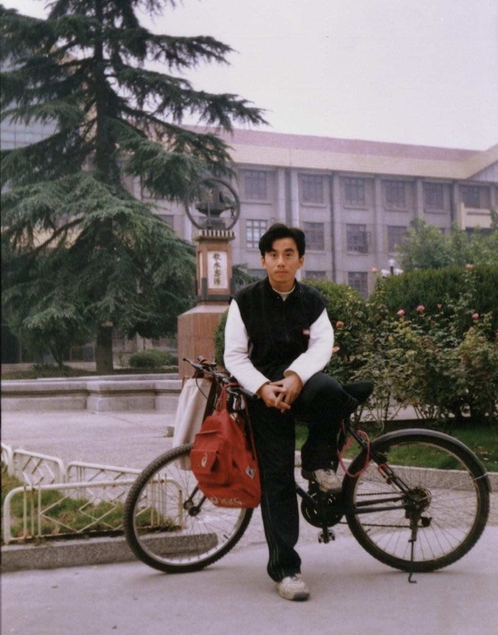 1998年11月,我在北门口的“饮水思源”碑前留影,自行车是当时主要的代步工具。