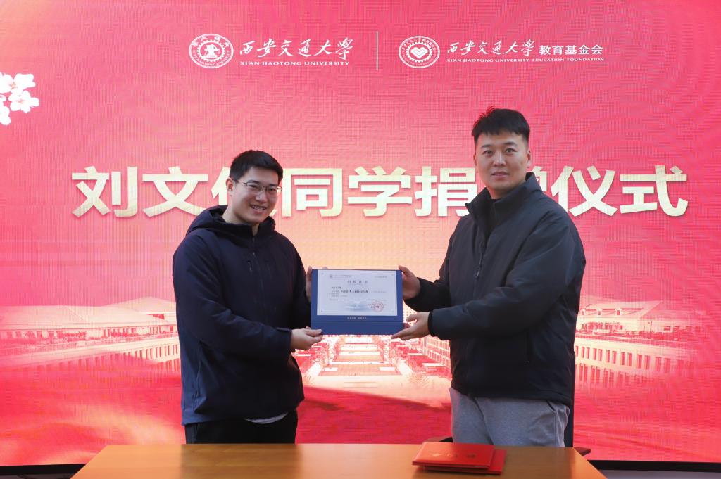 教育基金会尹承龙老师为刘文俊同学颁发捐赠证书