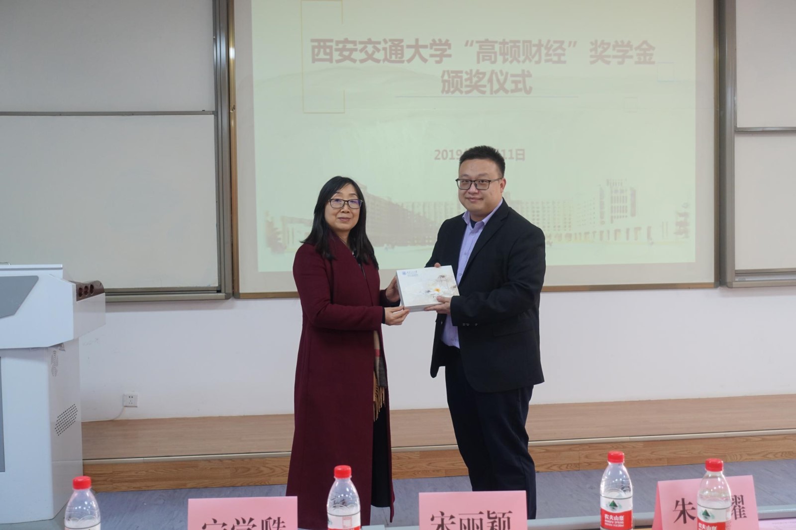 2019年12月13日西安交通大学 “高顿财经”奖学金颁奖仪式在财经东配二楼举行。高顿教育集团领导、经金学院、启德书院和宗濂书院领导以及辅导员老师出席仪式,并为在名企实习、国际名校研学、大学生创业、社会实践四方面表现突出的11位同学以及5个团队给予表彰奖励。颁奖仪式由经金学院周建伦副书记主持。
