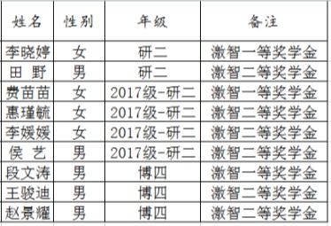 1.2018年12月29日,发放激智奖学金一等奖3人,每人3000元,共计0.9万元;发放激智奖学金二等奖6人,每人2000元,共计1.2万元。学生名单如下: