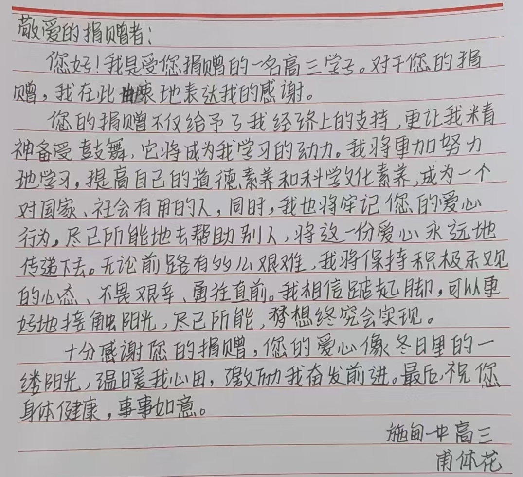 2024年12月,经过评选及公示,最终奖励施甸一中家庭贫困但品学兼优学生5名,1000元/人。