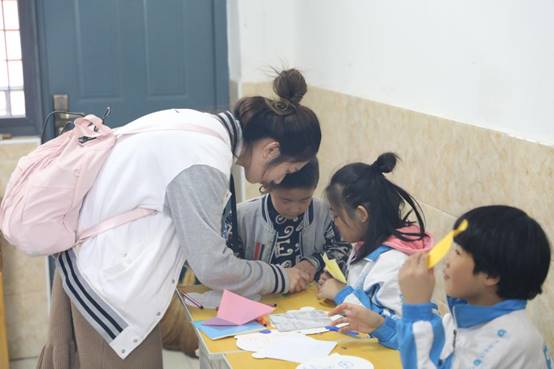 捐赠仪式结束后,交大天文社同学给高年级学生播放了天文视频,并在学校手语老师的帮助下,向孩子们介绍了宇宙的奇妙。好奇的孩子们互相打着手语交流着,虽然志愿者们无法完全理解他们的语言,但从他们的目光中就能感受到他们已经为宇宙的魅力着迷。此时,另一批志愿者们与魔方社同学一起走进教室,陪同低年级孩子们画扇子,教他们折纸和玩魔方。志愿者们耐心地和孩子们沟通,细致地教孩子们折纸,虽然交流困难,但这并不妨碍他们把满满的感动传递给志愿者们,有的孩子在自己的画上全神贯注地写上了自己和志愿者的名字,将这段回忆和情谊视如珍宝。