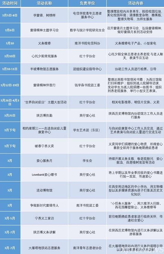 与此同时,全校30余个志愿公益类社团和组织也迎来了一年一度的“雷锋活动月”,将在未来两个月里集中优势,发挥特色,着眼于满足学校周边社区居民,开展“学习雷锋、奉献爱心”社区志愿服务活动。南洋青年志愿者协会将走进大雁塔地铁站,进行义务的道路引导以及自动售票机的使用讲解。英仔爱心社策划的Lovebank爱心赠书、流动博物馆活动面向西安周边地区的中小学,用文物模型以及多媒体资源向孩子们普及历史文化知识。学生艺术团和红十字协会以“尊老扶幼、扶贫助困”为主要内容,围绕“学业辅导、亲情陪伴、感受城市、自护教育、爱心捐赠”等内容,开展针对城市低收入群体和进城务工人员子女的志愿服务。