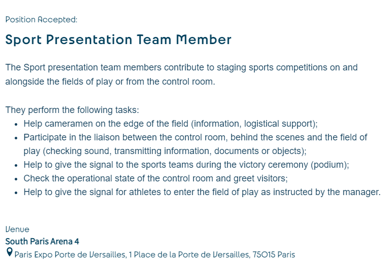 陈倬冰:参加奥运会相关工作是我从小到大的梦想,去年3月份,巴黎奥运会志愿者项目正式发布,我第一时间提交了申请。本次招募无国籍限制,在全球招募四万五千名志愿者,要求掌握英语或法语,需线上完成个人信息填写与心理测试,后续根据个人能力及面试成绩确定最终人选。本着热爱,我在志愿者选拔的一年中不断积累和突破,最终非常幸运地获得了志愿者资格,正式成为一名双奥志愿者,负责巴黎奥运会的大众马拉松项目与巴黎残奥会的乒乓球项目,期待奔赴这场流动的盛宴。