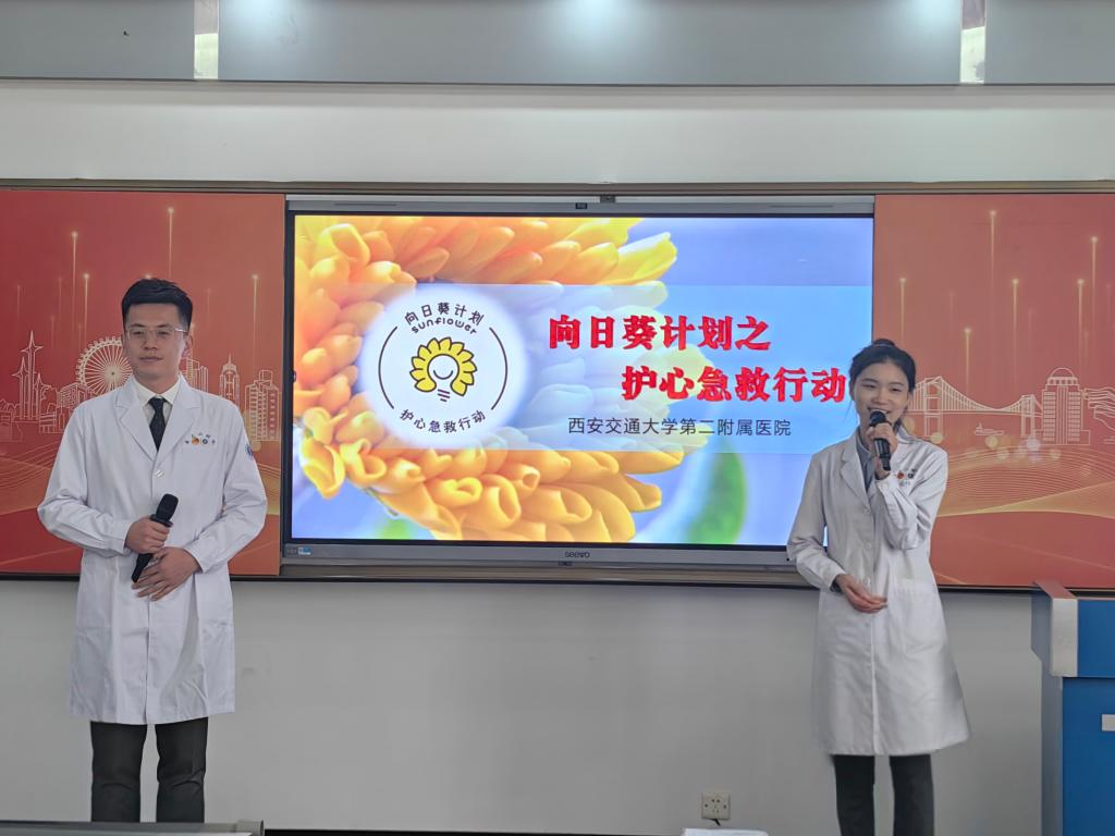 “向日葵计划之护心急救行动”由二附院急诊科发起,并在院团委指导下实施的志愿服务项目。项目集结了来自二附院急诊科、心内科等多个临床科室的志愿者,旨在普及急救知识与技能,通过一系列创新且富有成效的活动,向社会各界传达急救的重要性。作为全国青年文明号、全国巾帼文明岗的获得者,西安交大二附院急诊科还是欧洲复苏委员会生命支持课程的实训基地。在此基础上,“向日葵计划之护心急救行动”创造性地提出了“KUS”三步路径和“1+X”推广模式,自启动以来,不仅组织了多次线下培训活动,还深入学校、社区及公共场所,积极推广急救理念,有效提升了公众的安全意识和应对紧急情况的自救互救能力。为了进一步拓展服务范围,项目团队还特别开发了在线学习资源,借助互联网技术,大幅增强了项目的影响力和可及性。