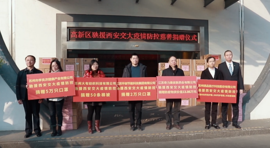 西安疫情牵动全国人民的心。为支持学校做好疫情防控工作,苏州高新区牵头,高新区(虎丘区)慈善总会及各板块积极动员社会各界力量奉献爱心。江苏奇力康皮肤药业有限公司、苏州市李良济健康产业有限公司、苏州德品医疗科技股份有限公司、江苏环创节能科技集团有限公司、苏州大有纺织科技有限公司、中科银隆(盐城)医疗用品有限公司、苏州钱万里桥小商品市场有限公司、苏州博洋化学股份有限公司、苏州绿叶日用品有限公司等9家爱心企业迅速响应,通过苏州高新区(虎丘区)慈善总会先后向学校捐赠口罩、消毒液、酒精棉球、防护服、护目镜、额温枪、吸收凝露等防护物资以及棉被、餐盒等生活物资,总价值146万余元。