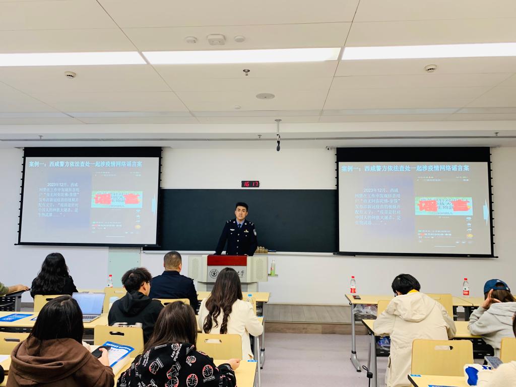 本次讲座特别邀请了西安市公安局西咸新区分局网络安全保卫大队民警、一级警长田嘉豪以“打击网络谣言,维护清朗网络”为题为大家带来一场生动的公开课。田嘉豪曾参加江苏卫视《一站到底》大型知识挑战节目,获得“战神”称号,先后获得个人三等功、优秀共产党员、陕西省"三秦最美家庭标兵”等荣誉。他结合西咸新区近年来发生的实际案例向同学们讲解网络安全知识,以案释法,深入浅出地剖析什么是网络谣言、网络谣言的种类和网络谣言的危害性,强化学生鉴别网络谣言的能力,引导大家自觉抵制网络谣言,保护自身权益。他的讲解通俗易懂、语言形象生动,引得同学们的阵阵掌声。